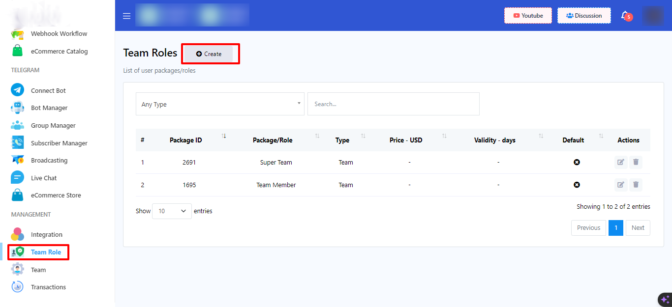 - Click the `Create` button to add a new team. Provide name of the Team and toggle various option you like.
